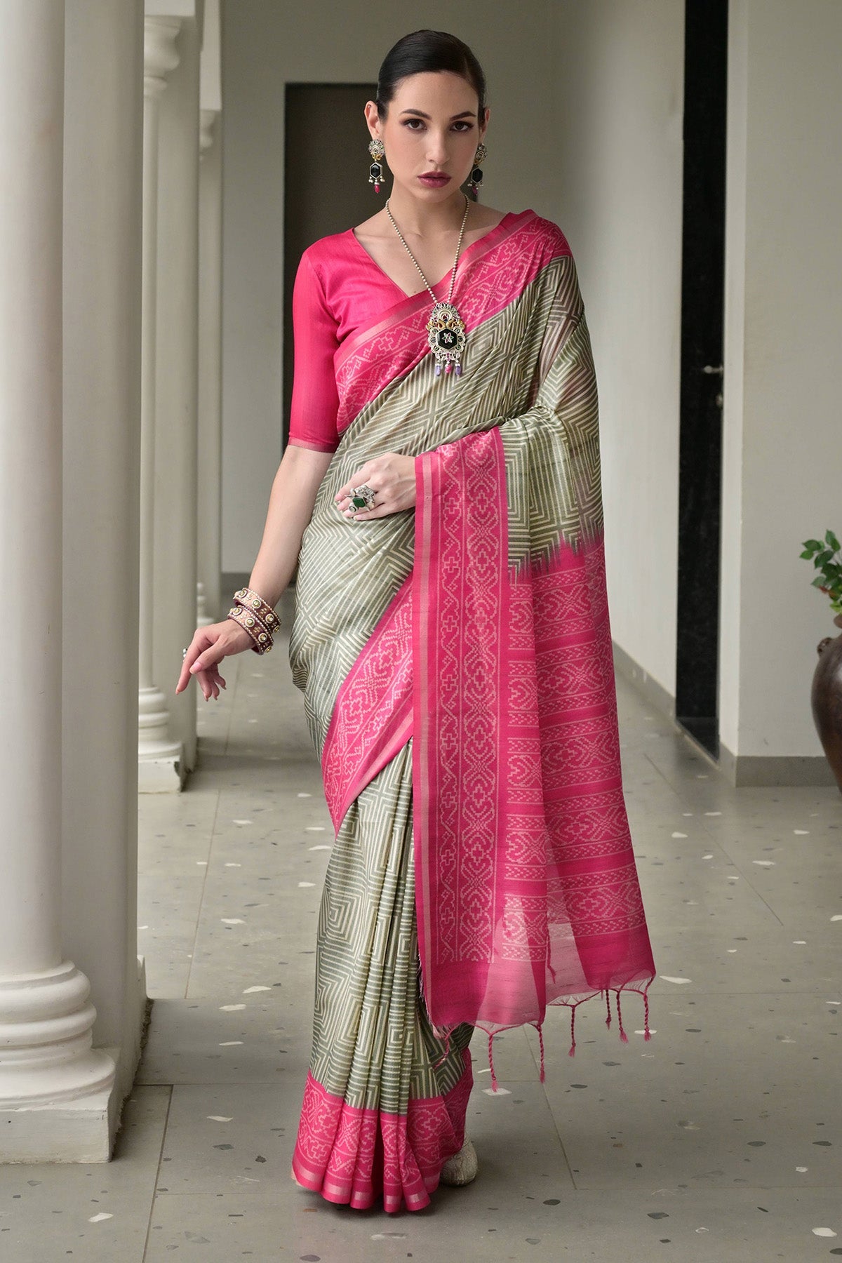 Pink geometry printed soft tussar silk saree with contrast ikkat pallu and border and solid unstitched blouse piece