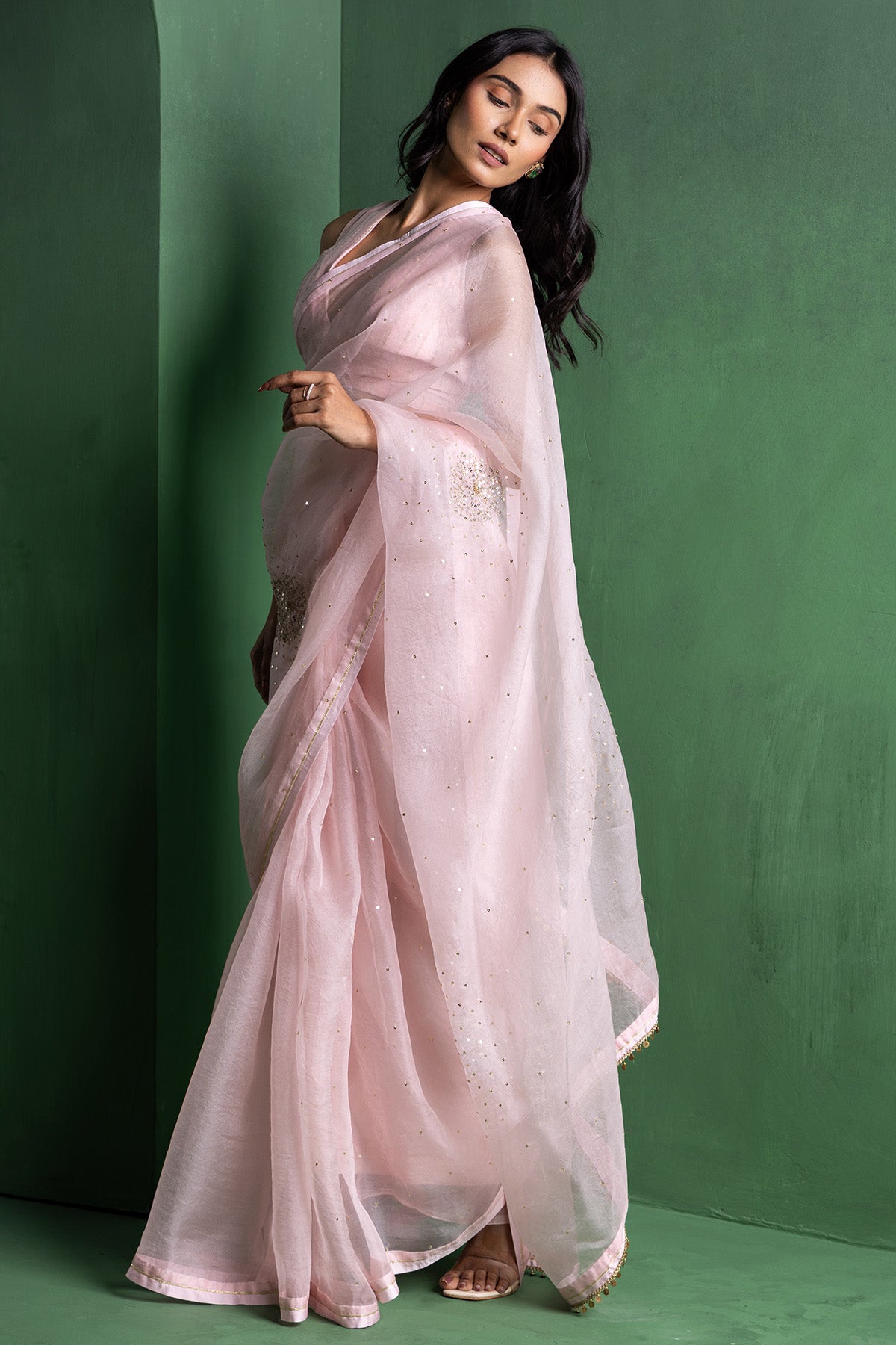 Baby pink silk organza & chanderi jacquard floral motifs saree featuring adda embroidery, sequins & zari lace detailing work paired with unstitched blouse piece