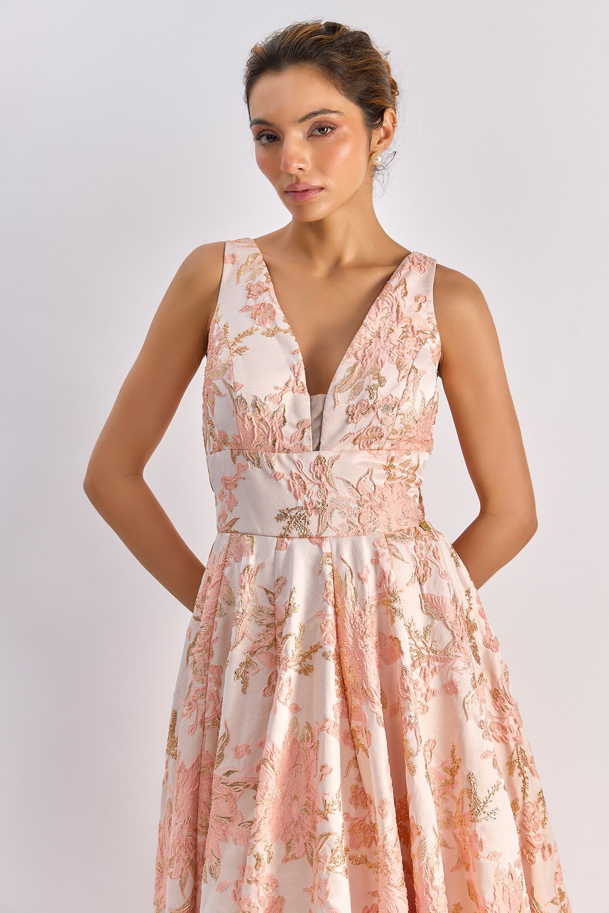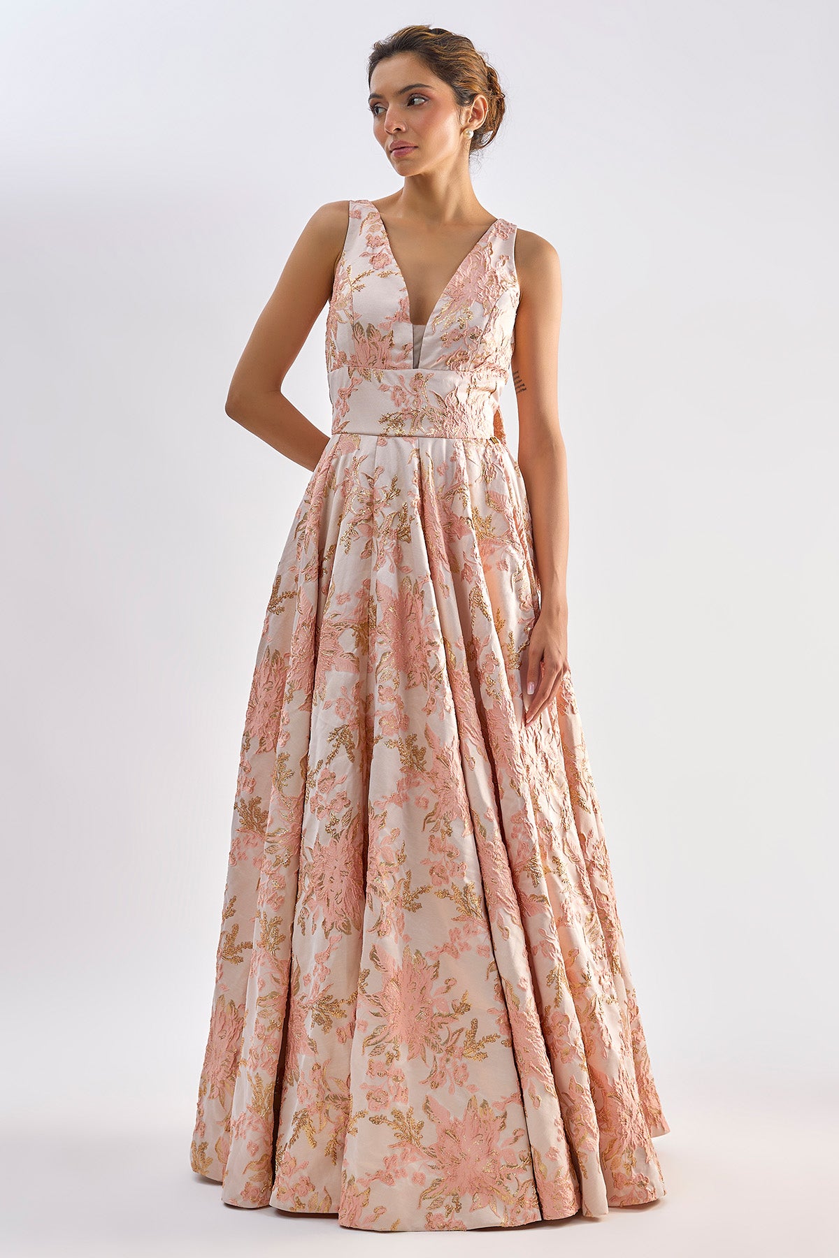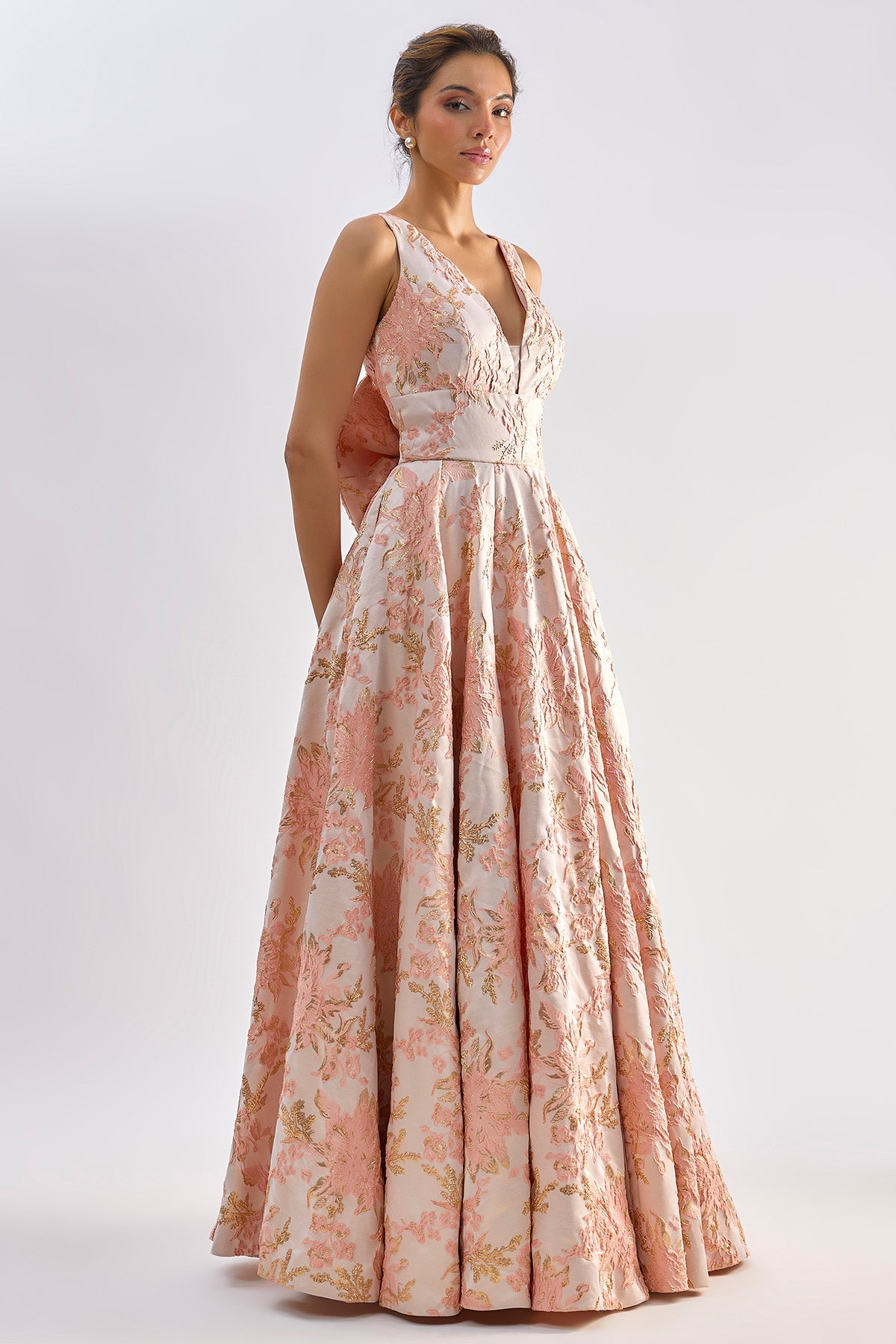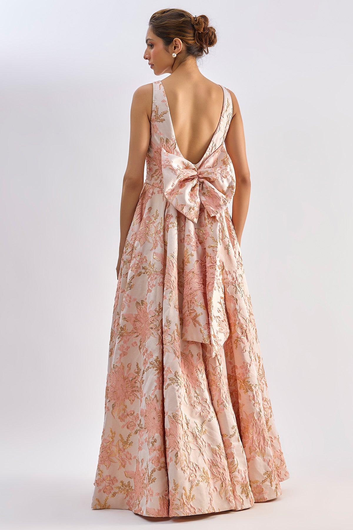 Pink jacquard floral textured gown with back bow detailing. This gown has shantoon lining