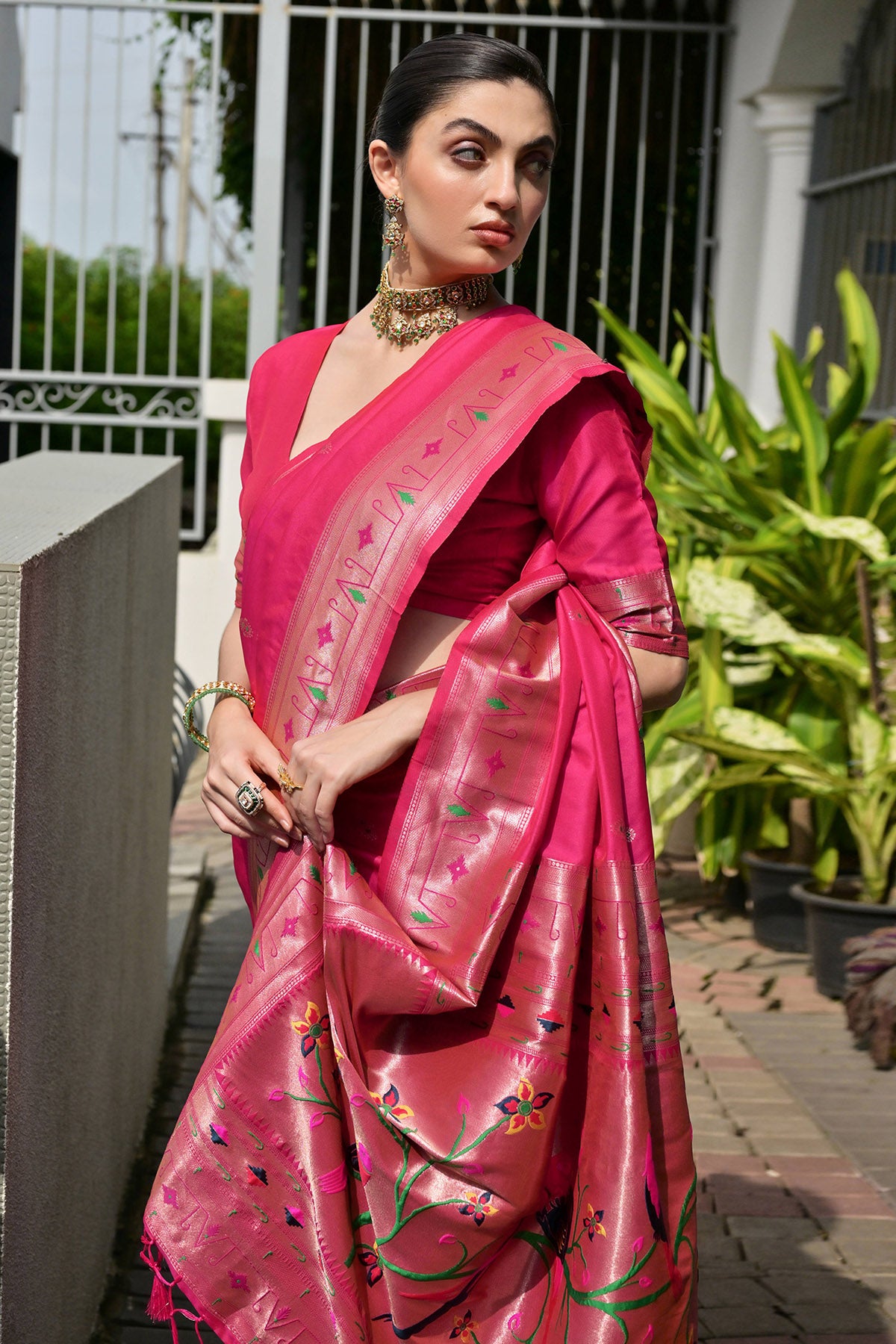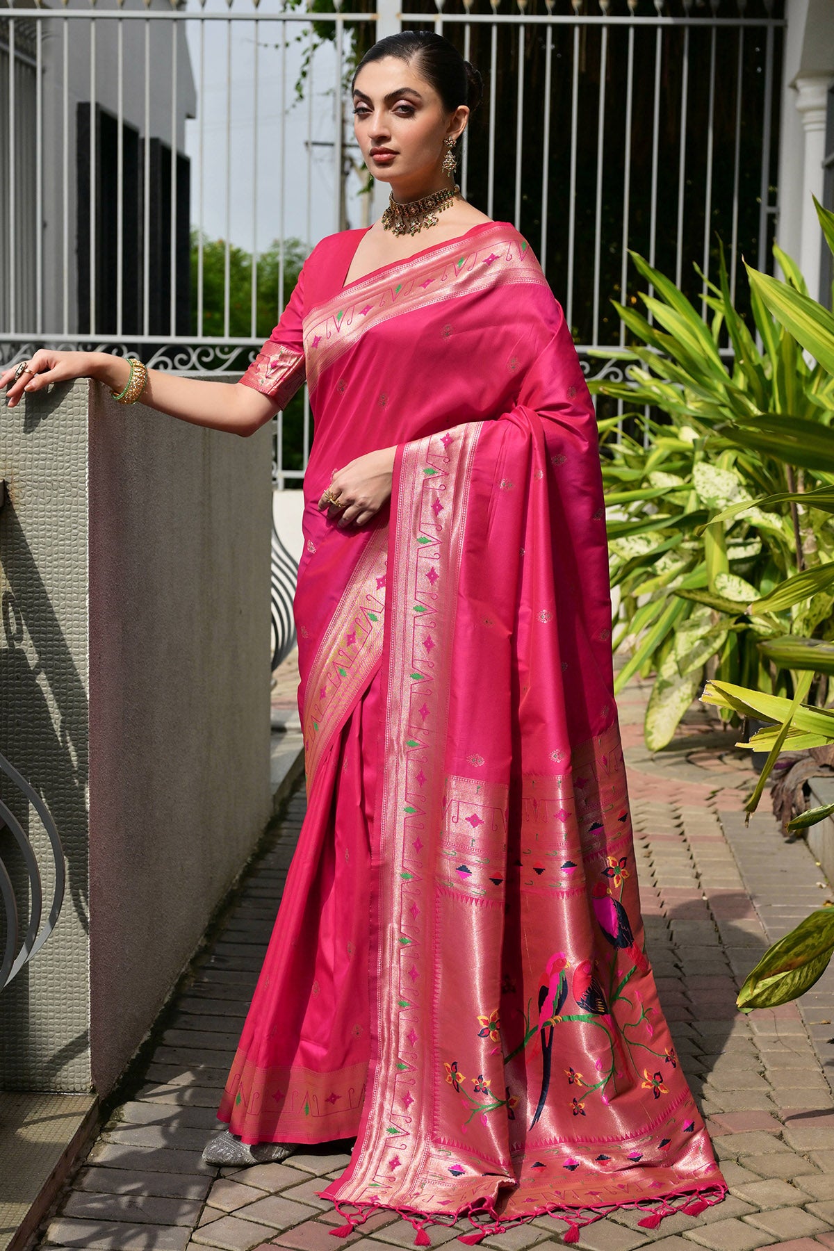 Pink meenakari weaves paithani pallu with pure zari woven border paithani silk saree with unstitched blouse piece