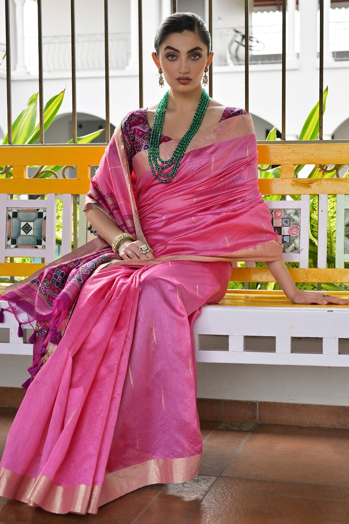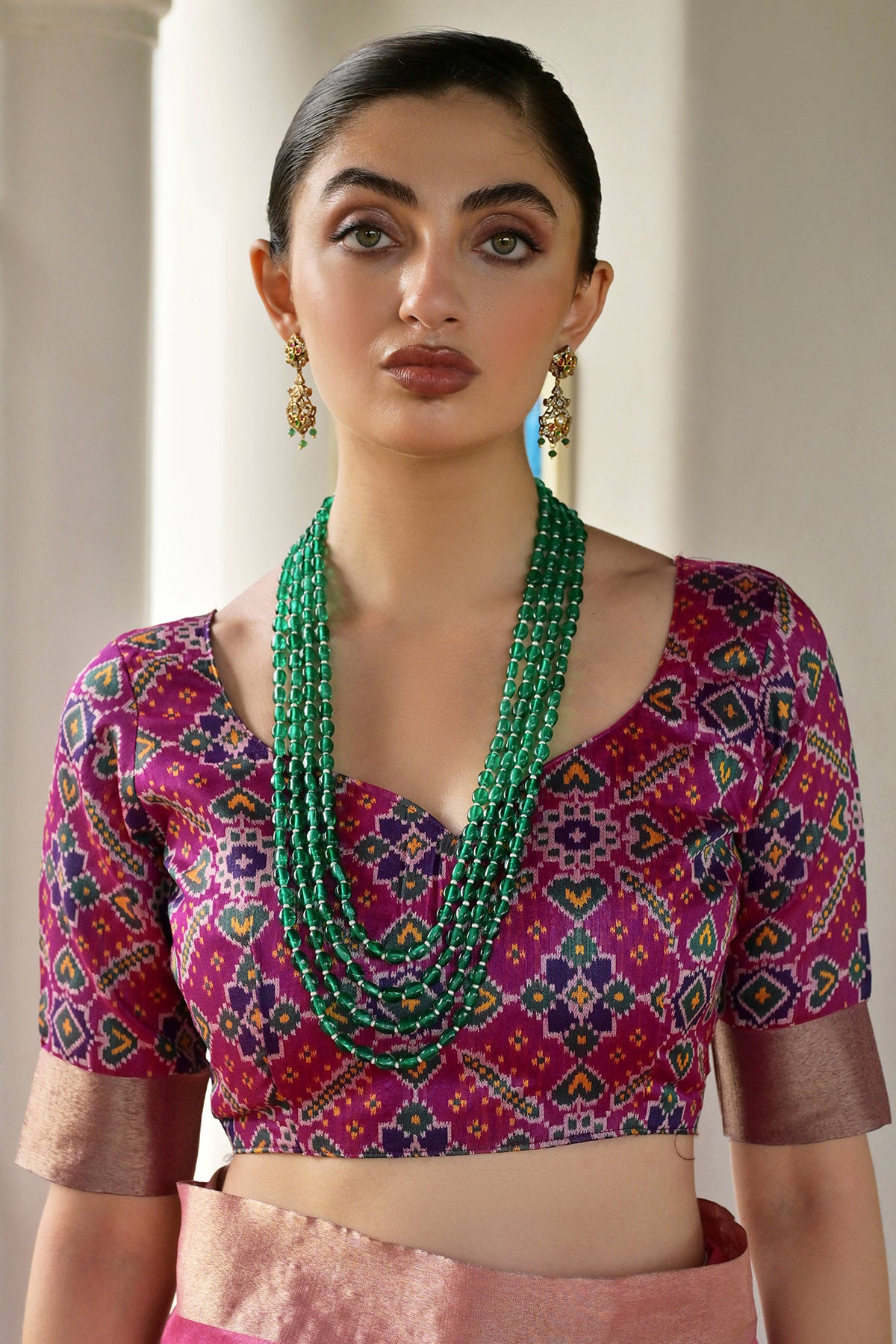 Pink and wine meenakari woven patola pallu and pure zari border saree with contrast patola unstitched blouse piece