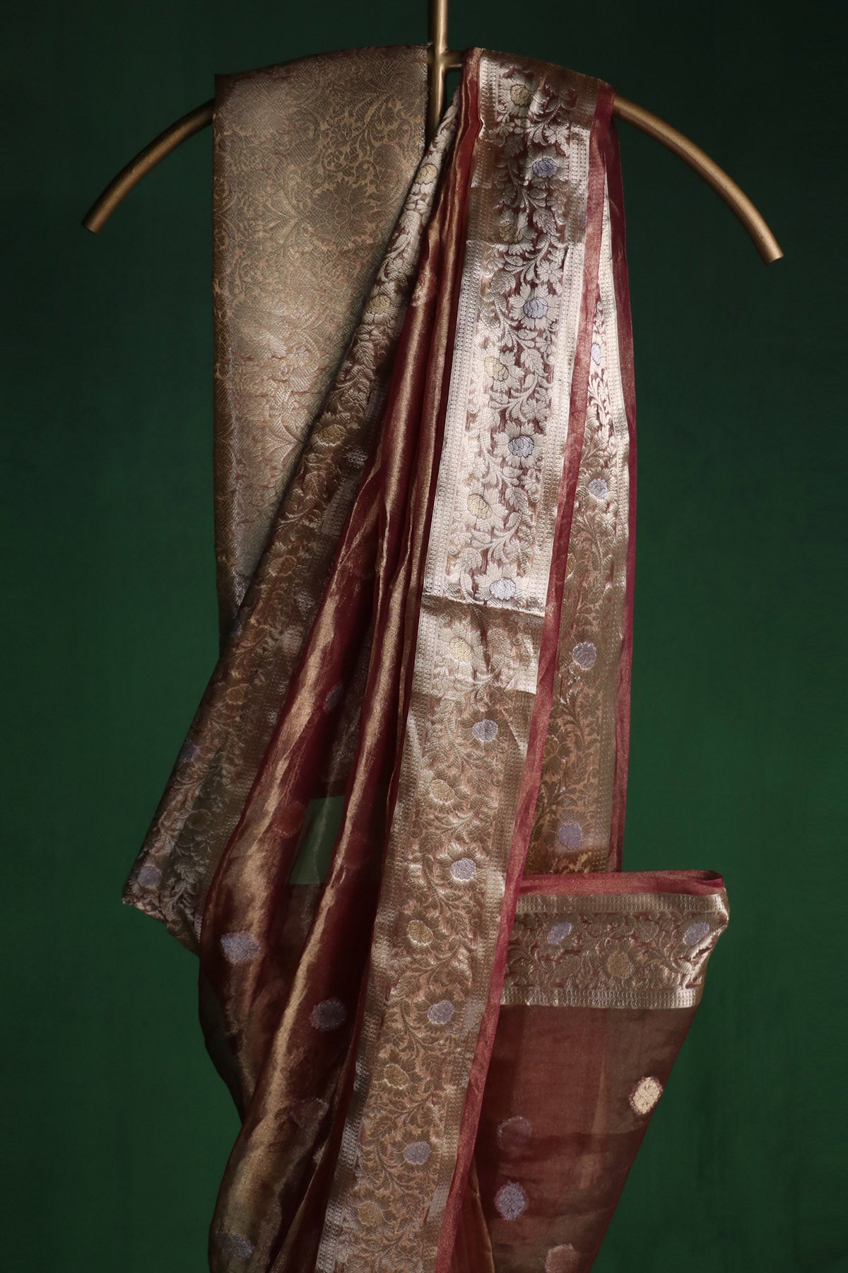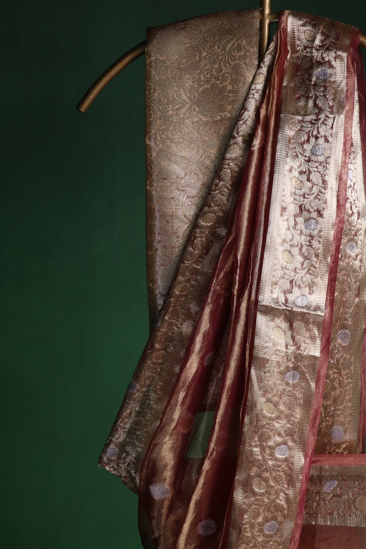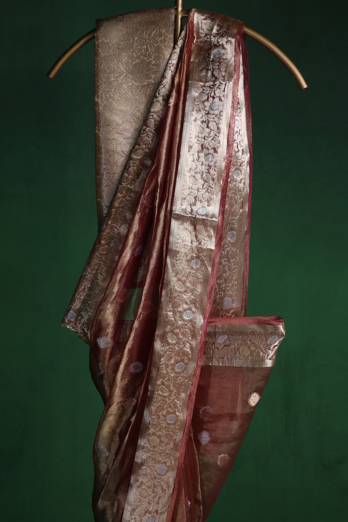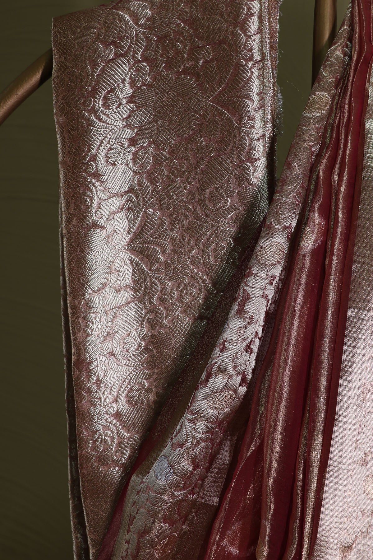 Plum silk tissue saree with fluid drape featuring banarasi weave, woven border, jaal pattern & pure zari work paired with unstitched blouse piece