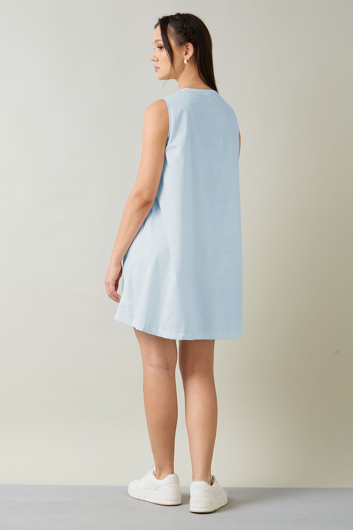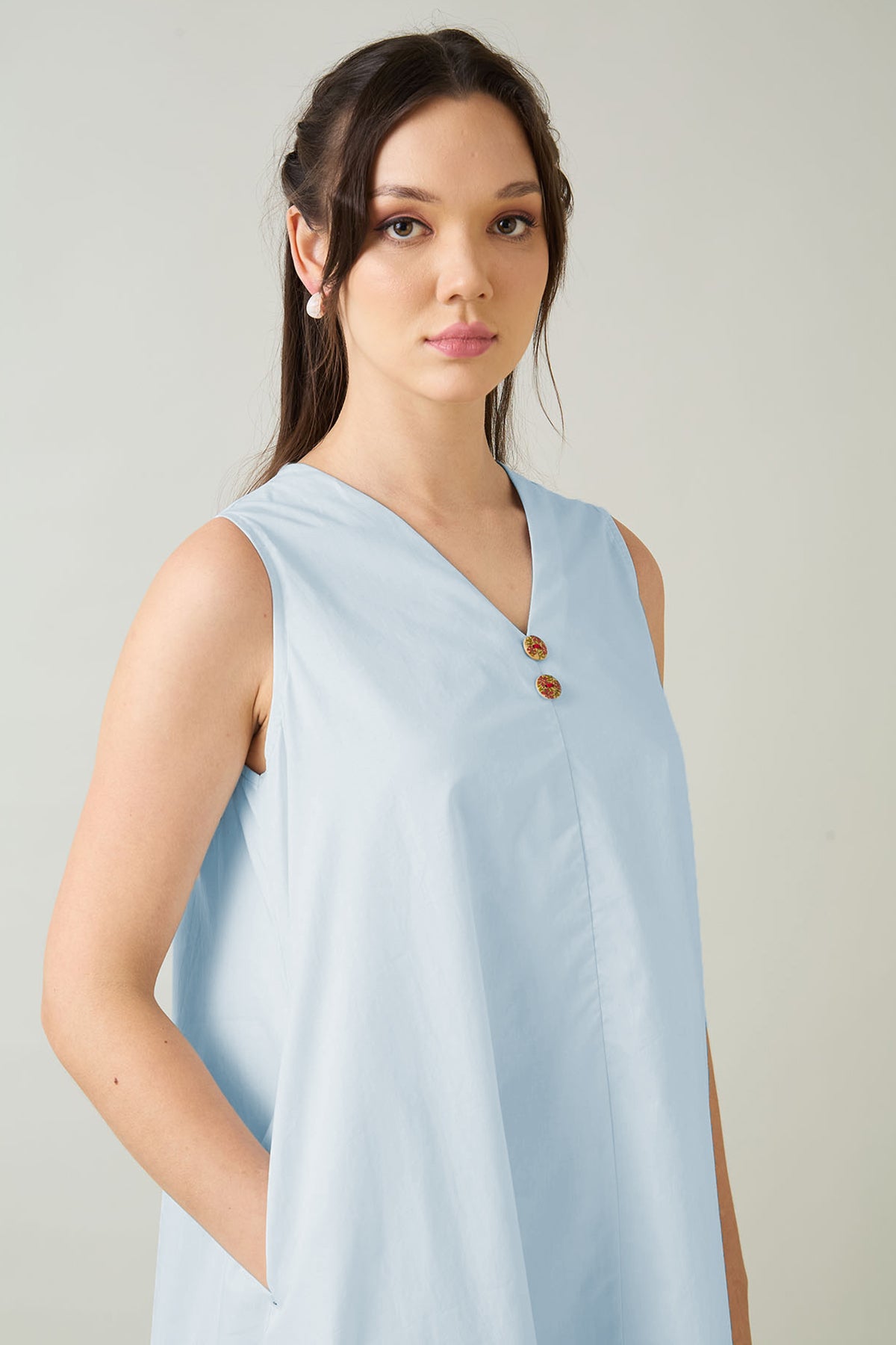 Powder blue 100% cotton poplin sleeveless a-line mini dress with v-neck, wooden buttons and side pockets with buttons. The length of the dress is 35 inches