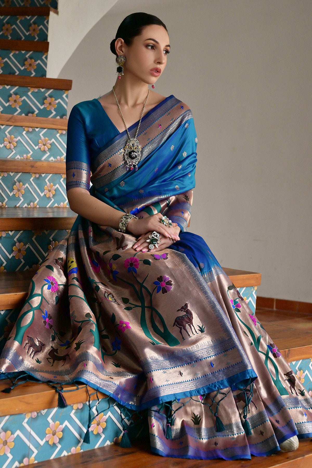 Rama meenakari weaves with pure zari woven big border paithani silk saree with unstitched blouse piece. The length of the saree is 5.5 mtr & blouse piece is 0.8 mtr