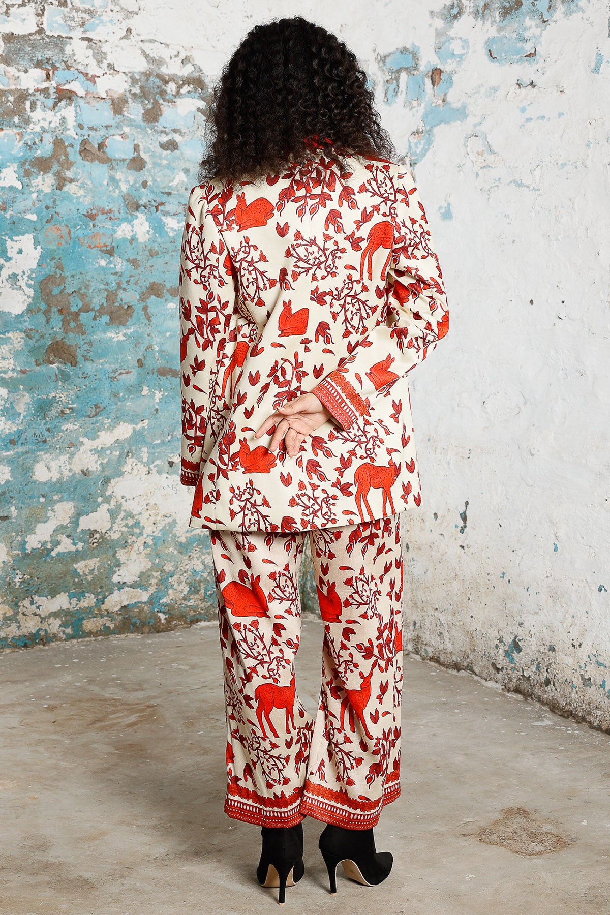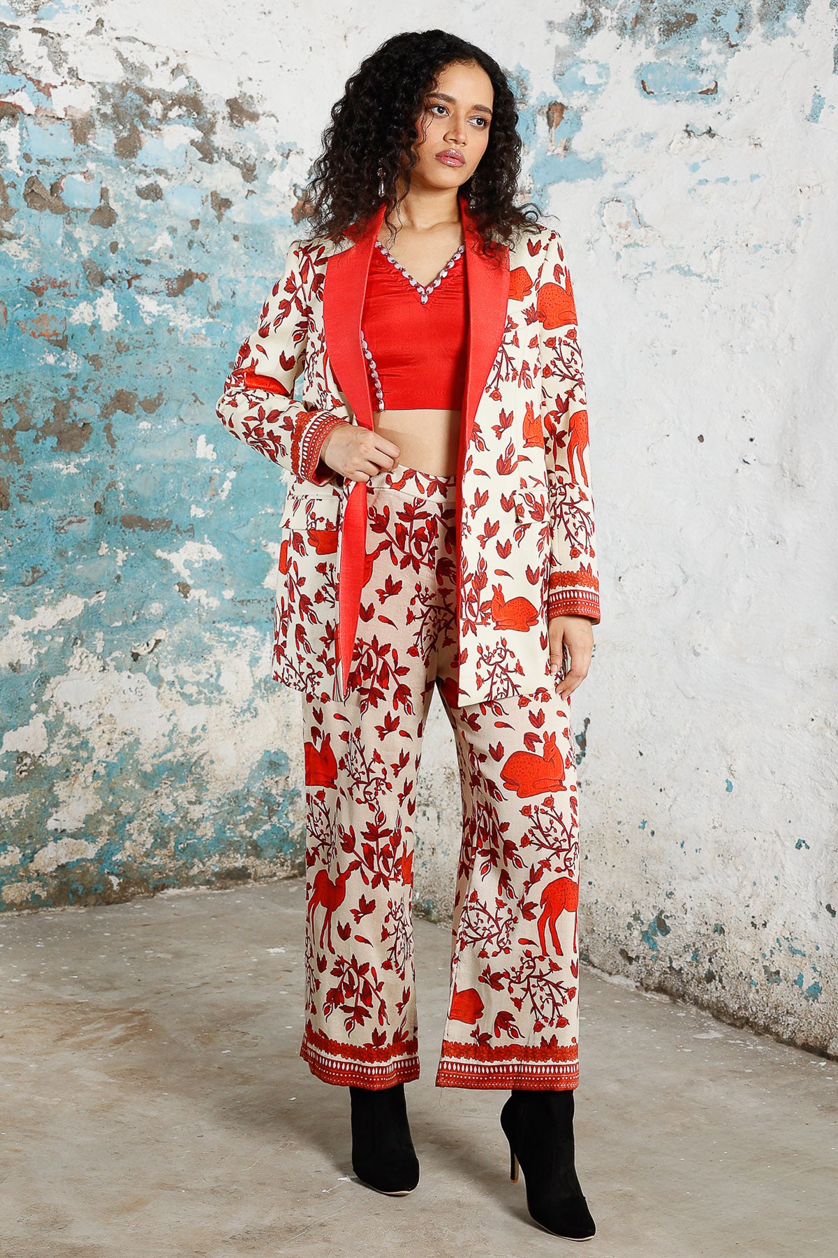 Red & beige banarasi cotton silk printed kurta set featuring aari hand embroidery work bustier with full sleeves coat and blazer collar paired with straight pants