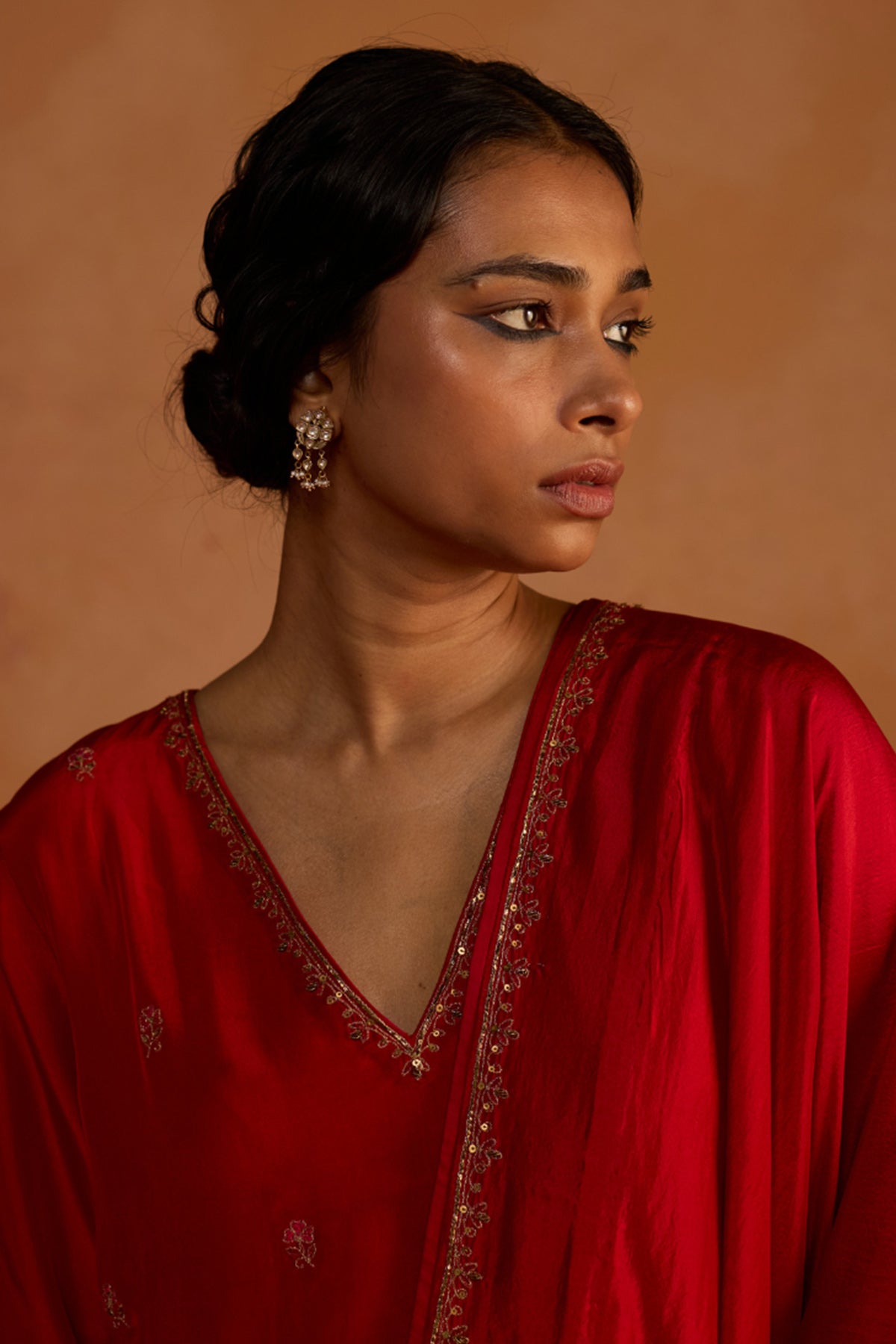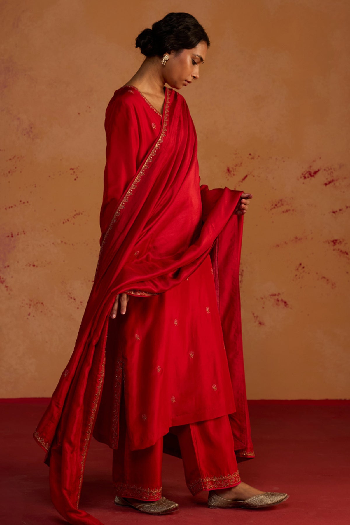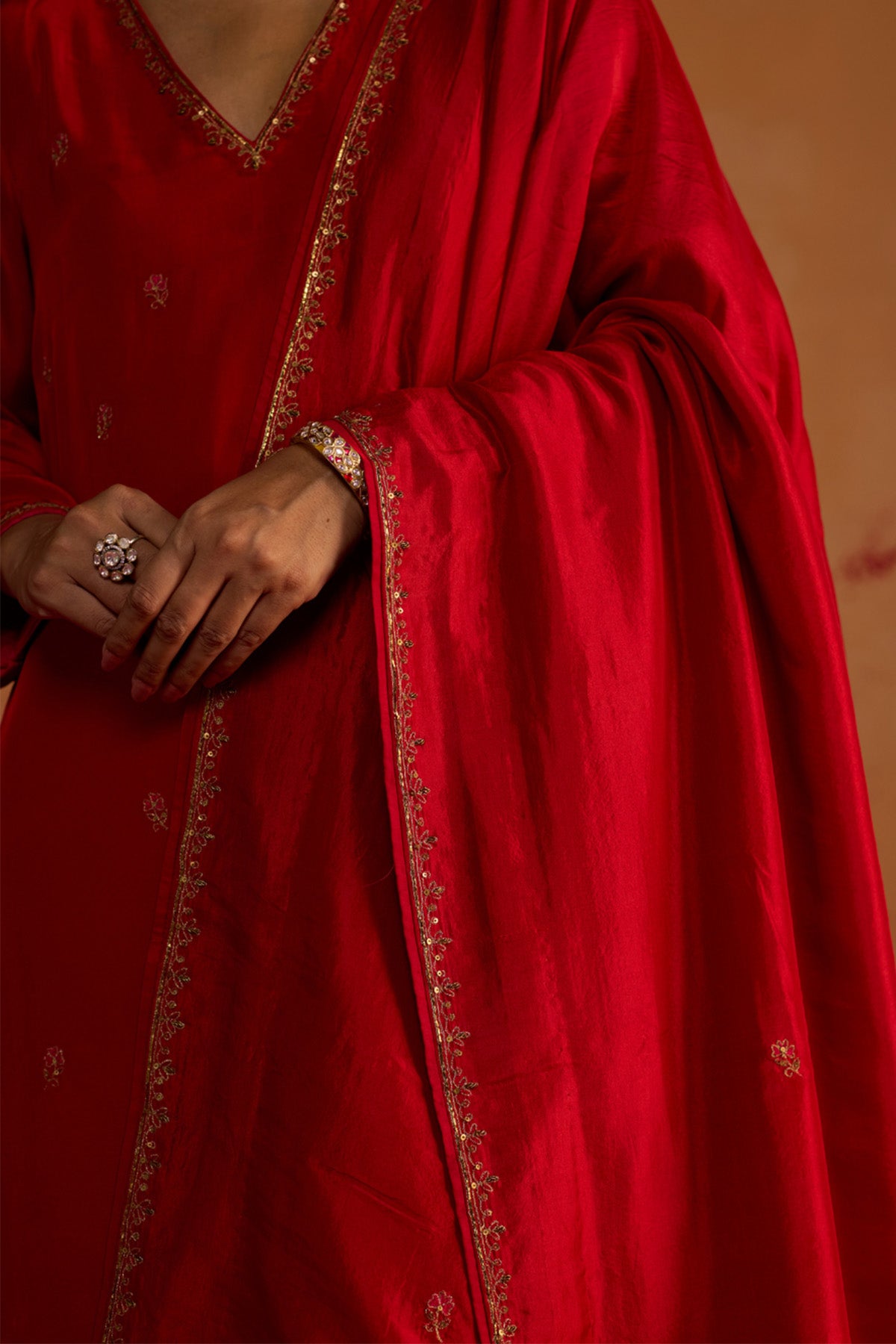 Red pure silk kurta set featuring sequins work kurta with 3/4 sleeves and V neck paired with pants and organza zardosi embroidery dupatta