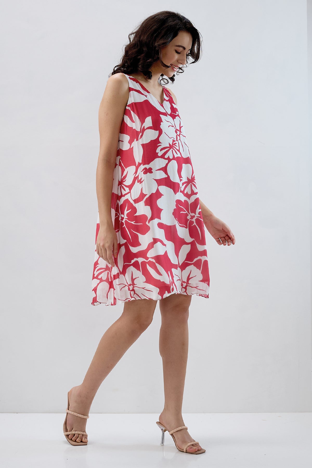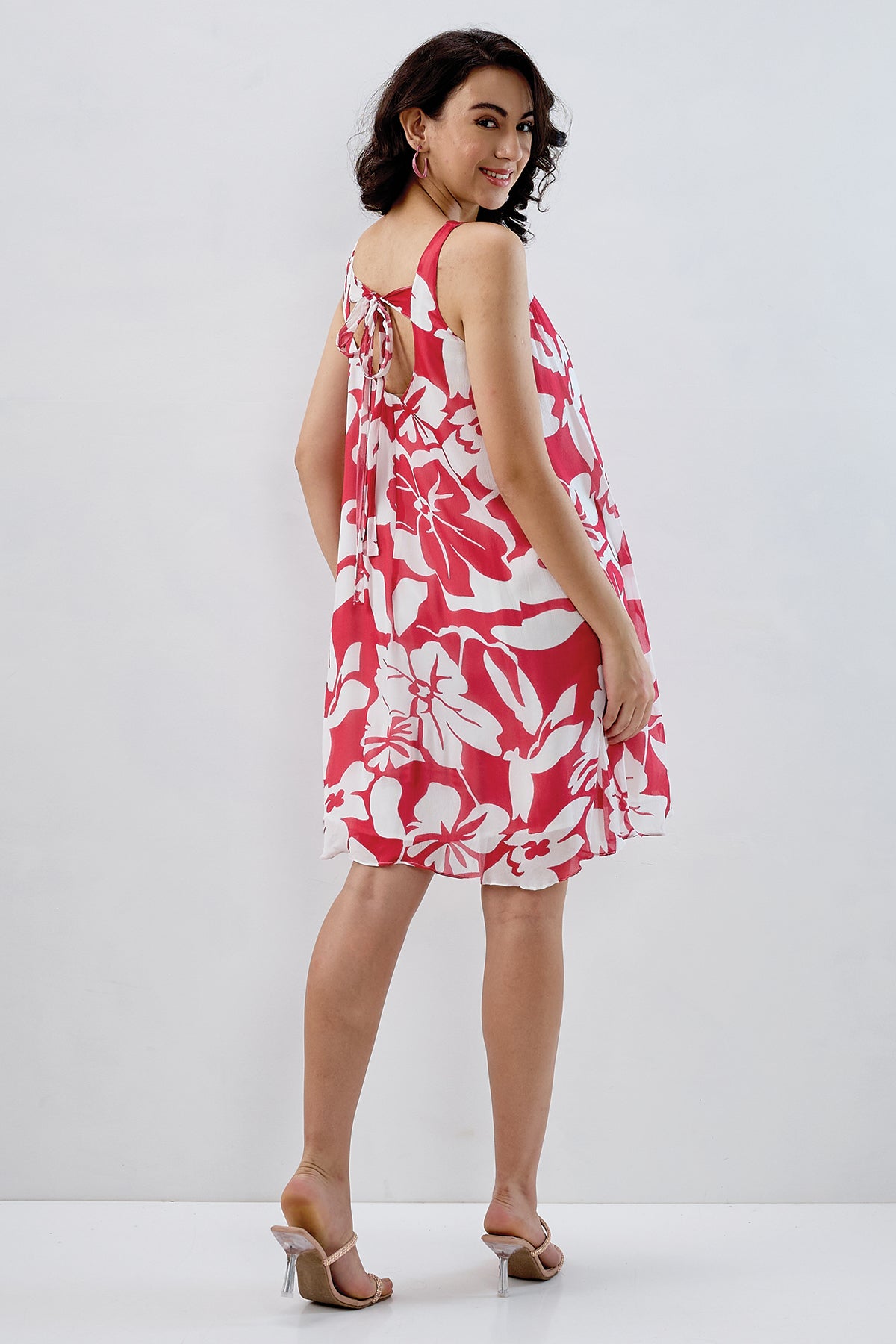 Red and white chinnon mini dress with floral print, tie knot at the back, flared hem and butter crepe lining. The length of the dress is 35 inches