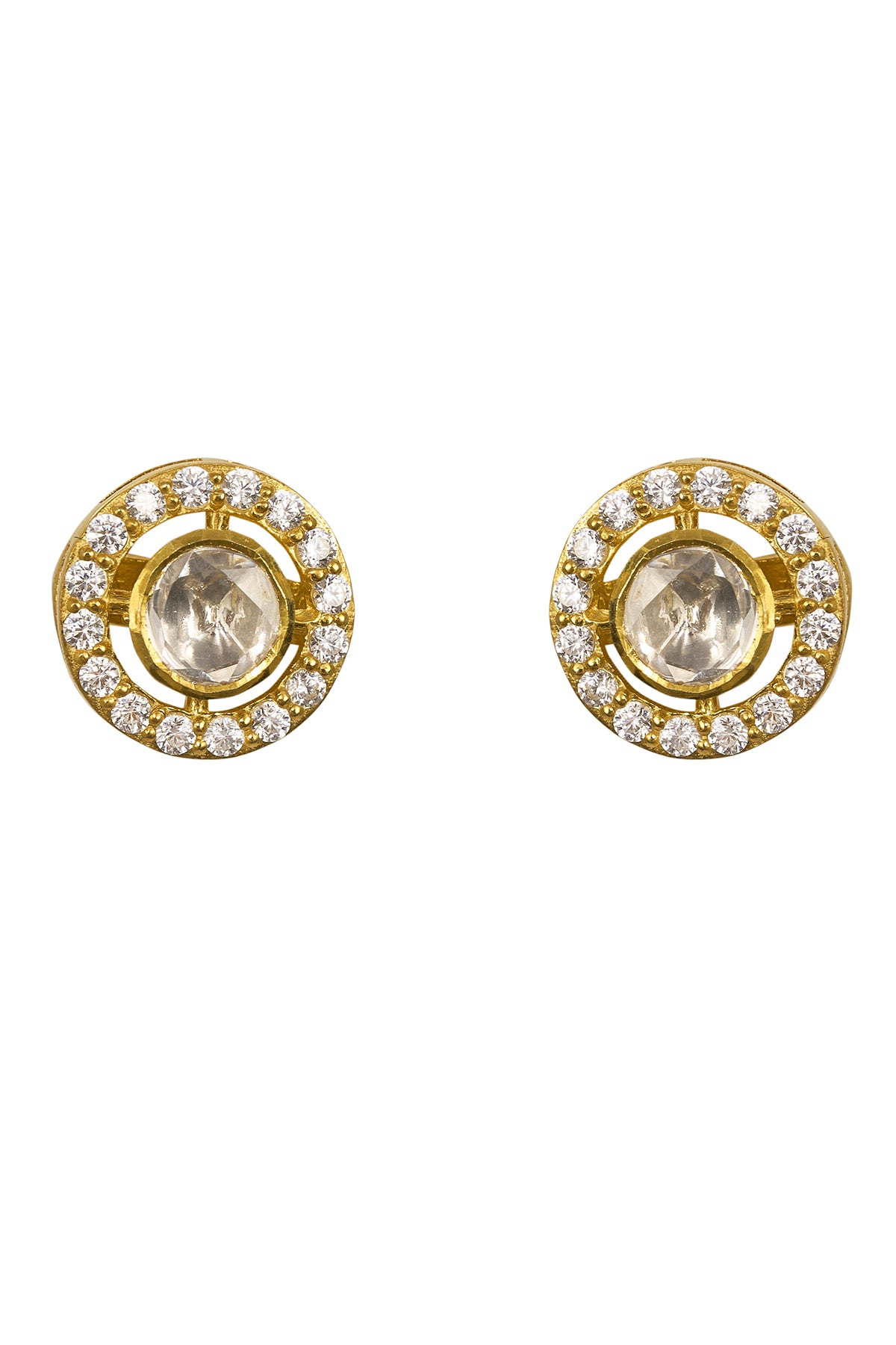 Yellow 925 silver round diamond studded earrings with moissanite polki, gold plating and screw closure. The dimension is 0.39 x 0.39