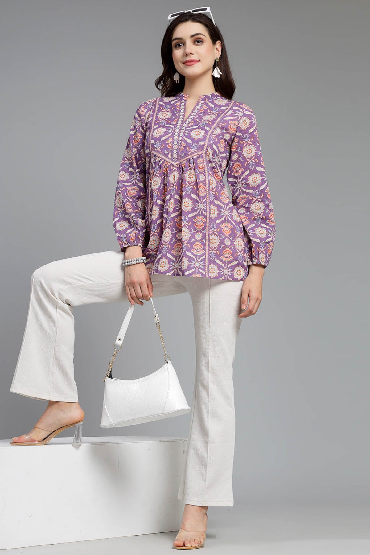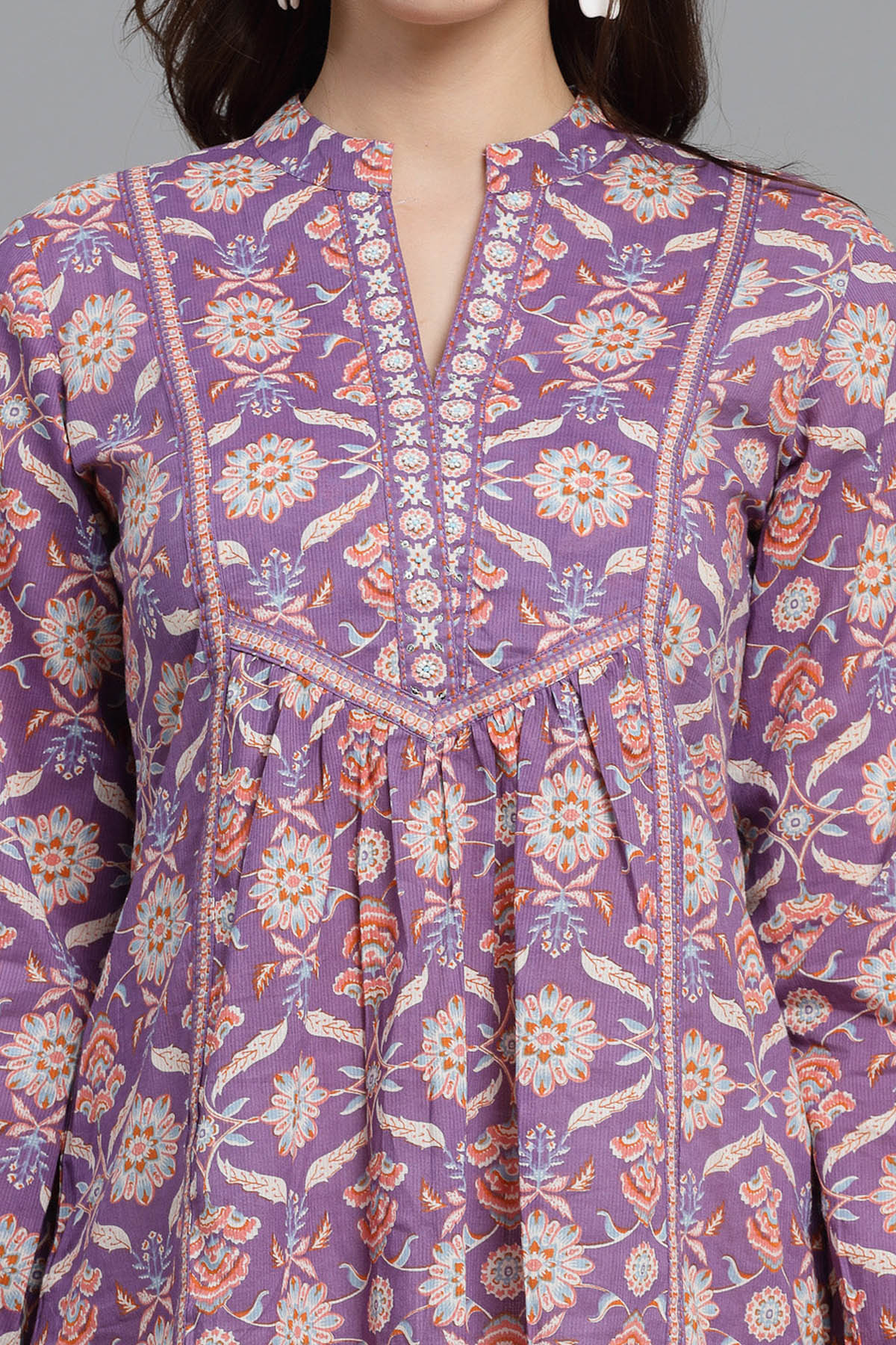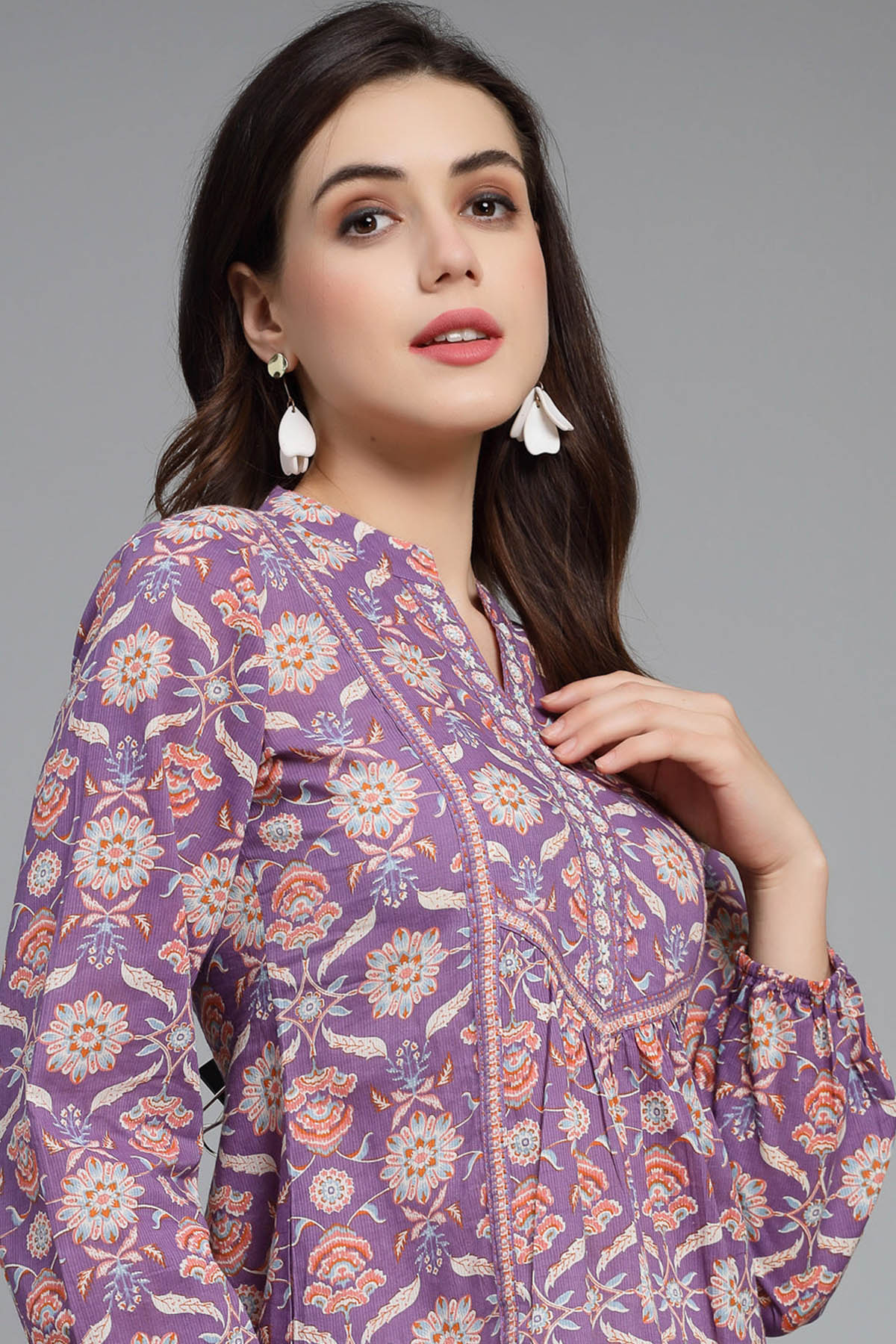 Royal purple pure cotton floral printed top with adda work details, A line cut,mandarin collar and full sleeves