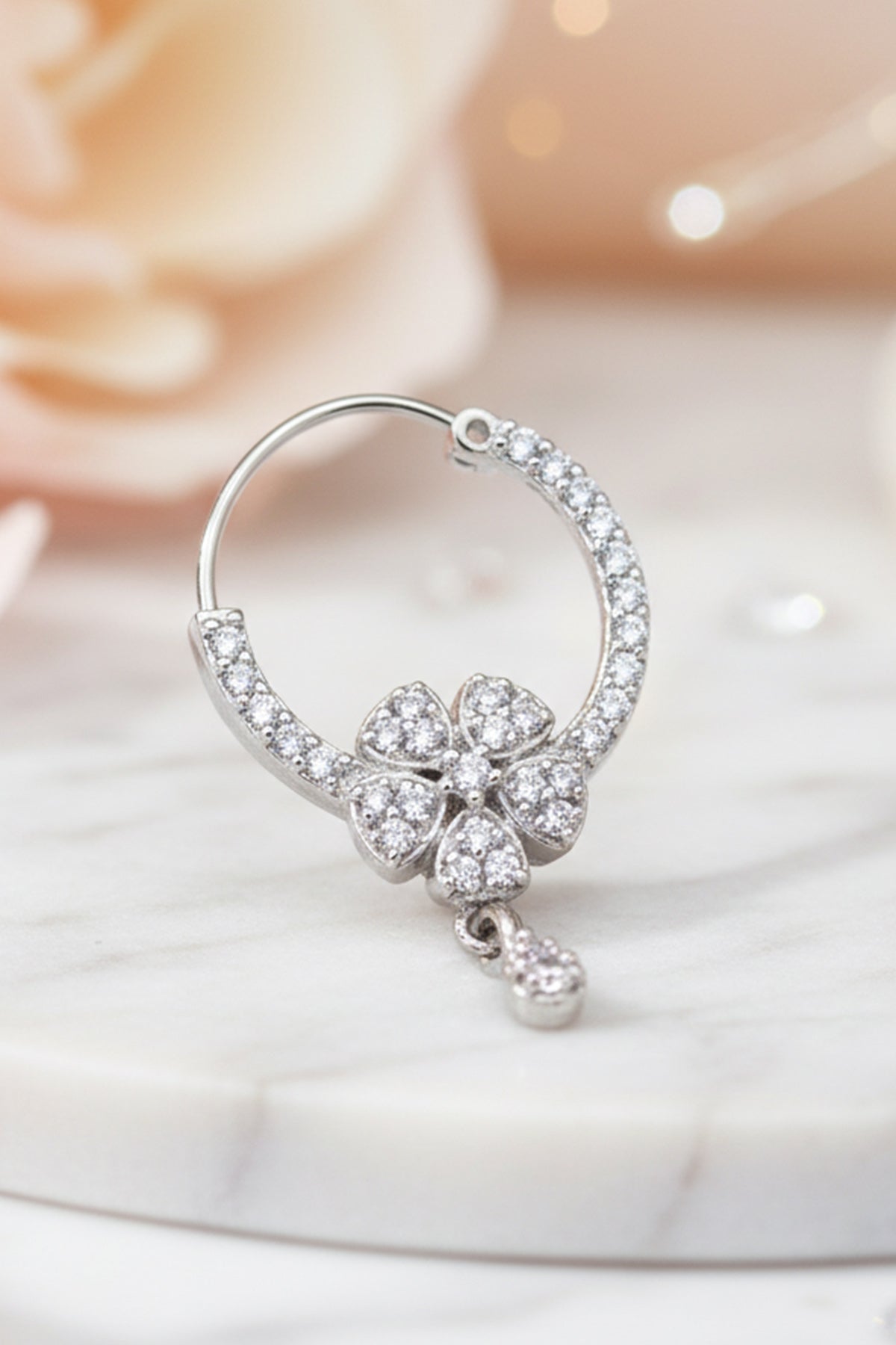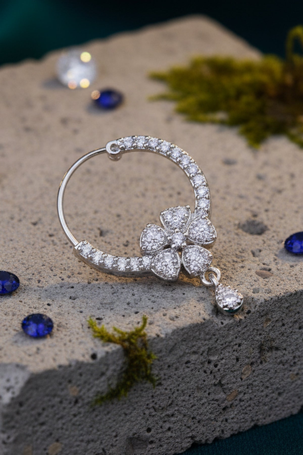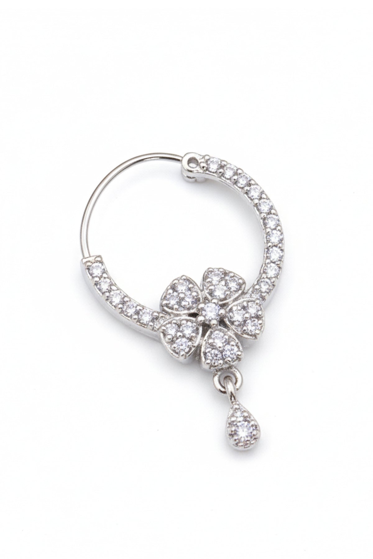 Silver mixed metal floral shape nose ring with round cut cubic zirconia stone, curved hoop, teardrop shape and sparkling stones