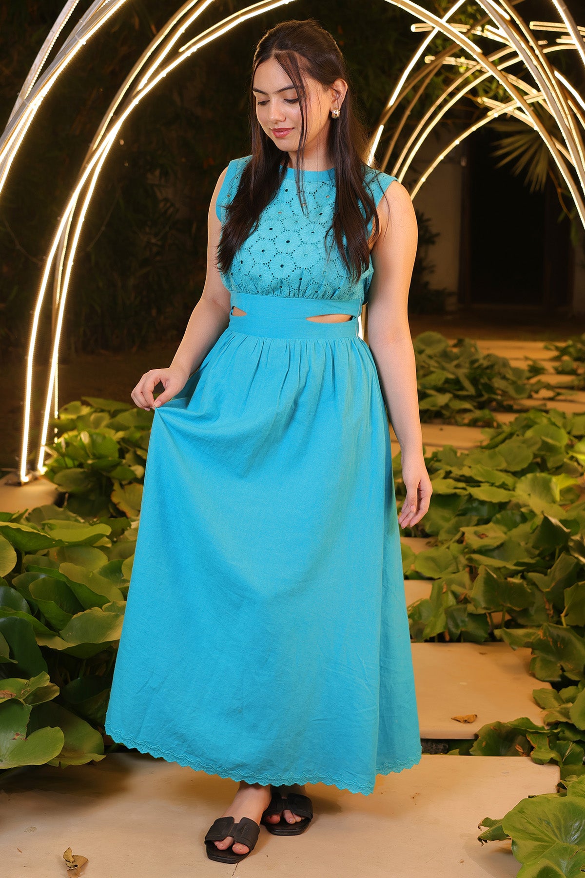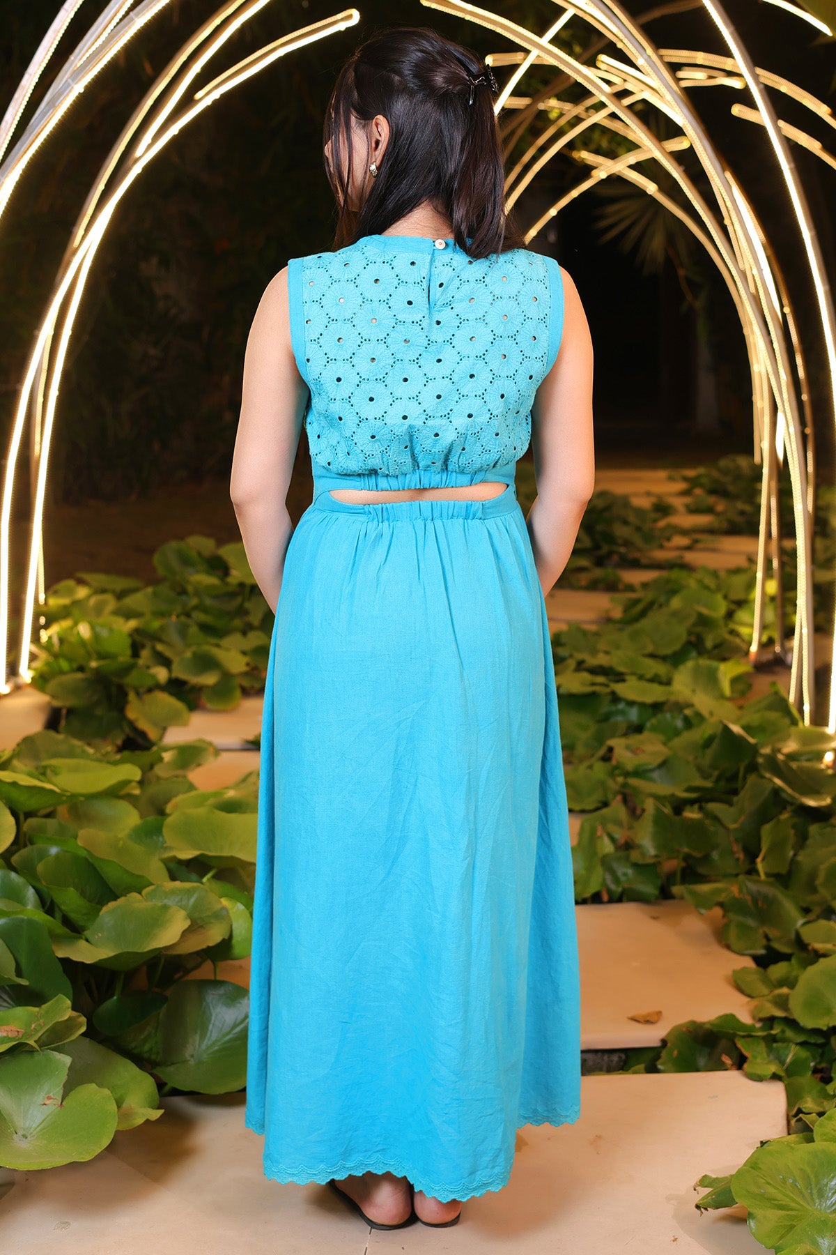 Teal Blue cotton linen maxi dress with floral embroidery on front, mandarin collar, back key hole and sleeveless