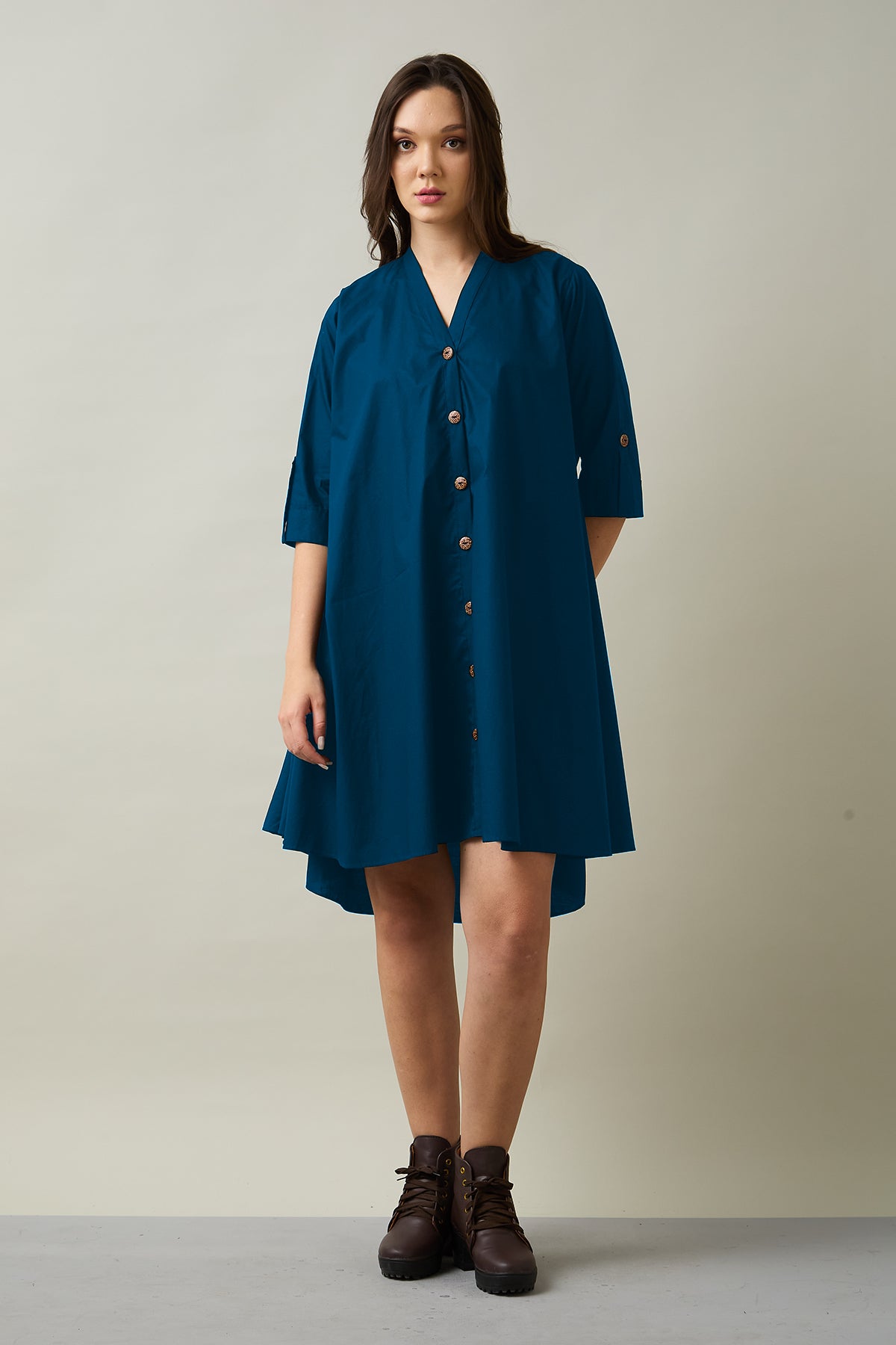 Teal blue 100% cotton (poplin) relaxed fit oversized dress with high low hem, wooden buttons and v-neck. The front length is 33 inches and back length is 40 inches