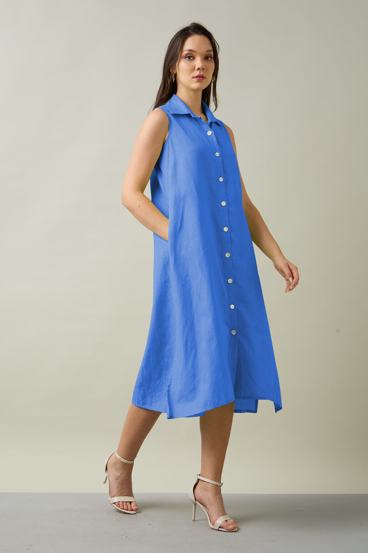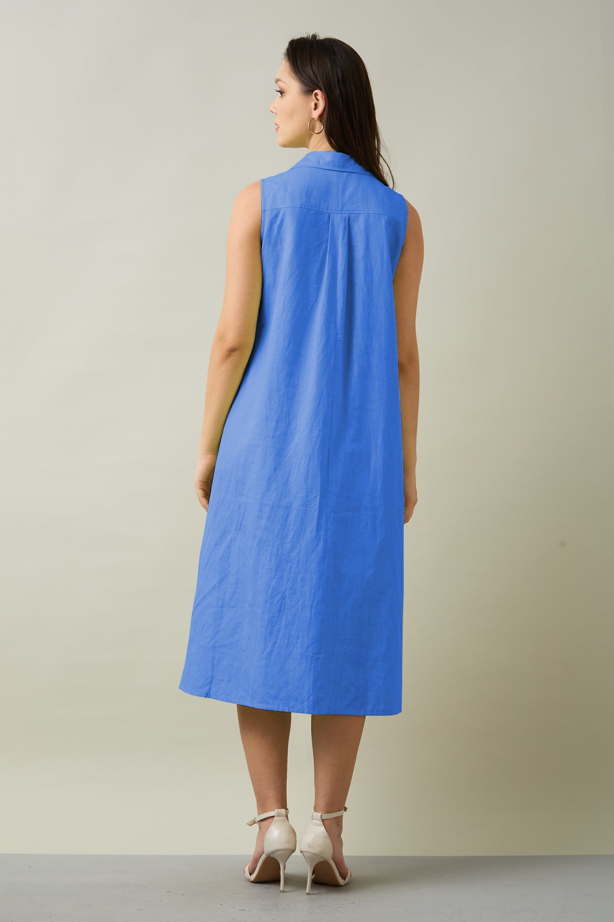Veri Peri cotton linen sleeveless shirt dress with collar, buttons, side slit, box pleat at back and side pockets. The length of the dress is 44 inches