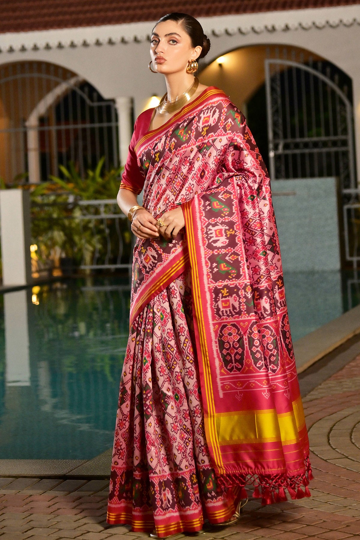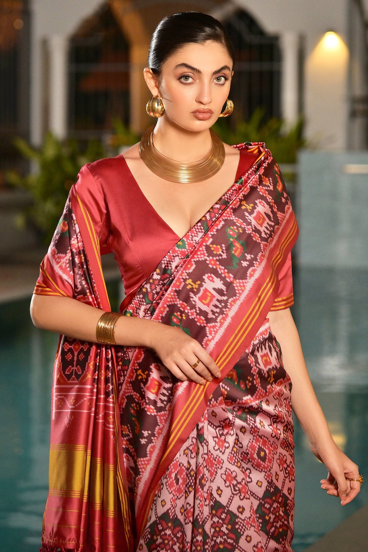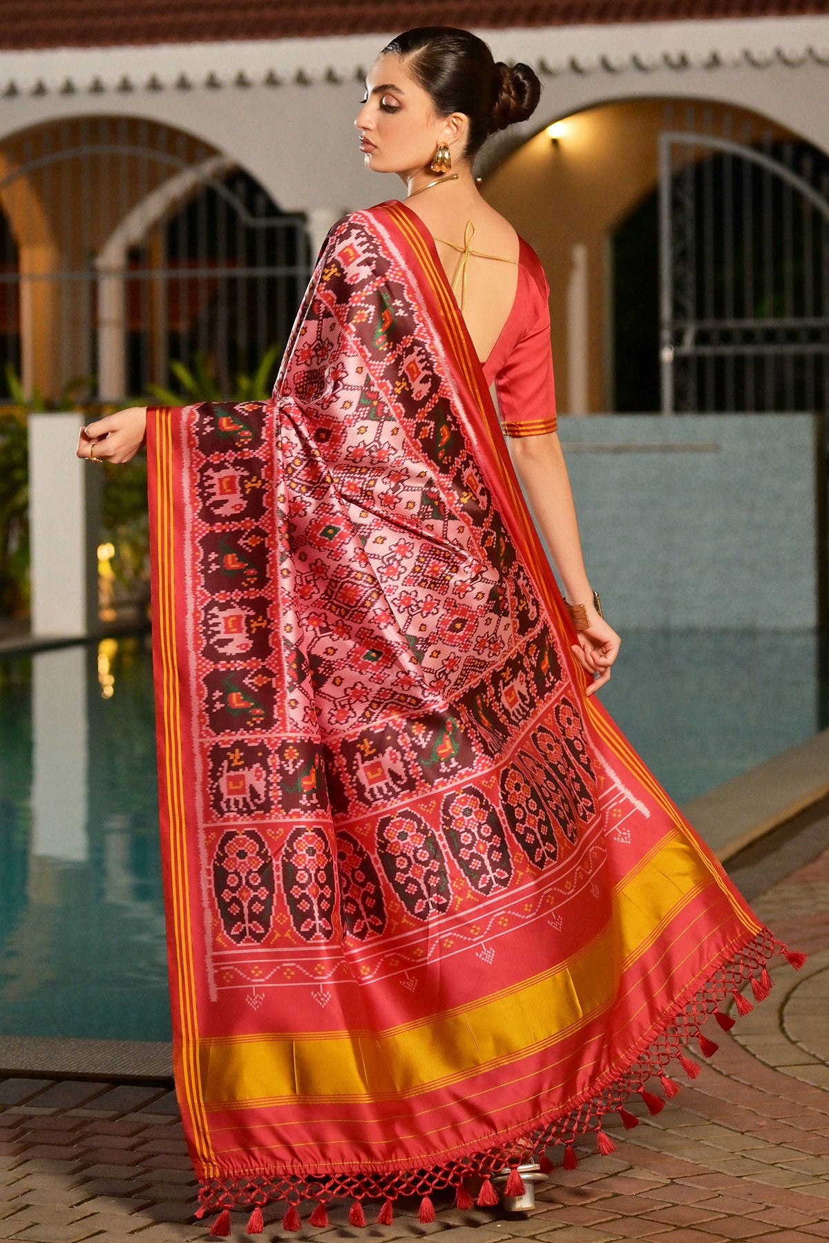 White and red golden lagdi patta pallu and border with rajkoti ikkat banarasi silk patola printed saree with unstitched blouse piece