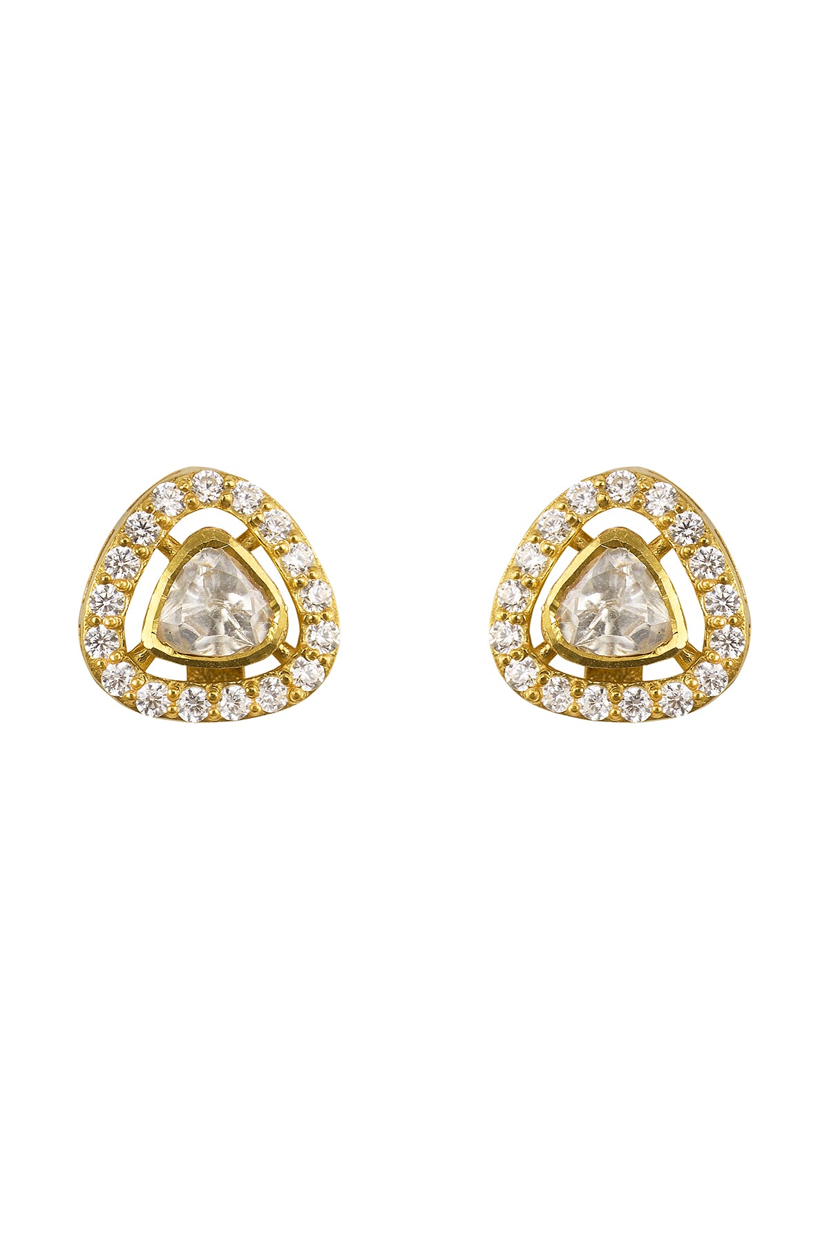 Yellow 925 silver diamond studded earrings with moissanite polki and screw closure. The dimension is 0.39 x 0.39