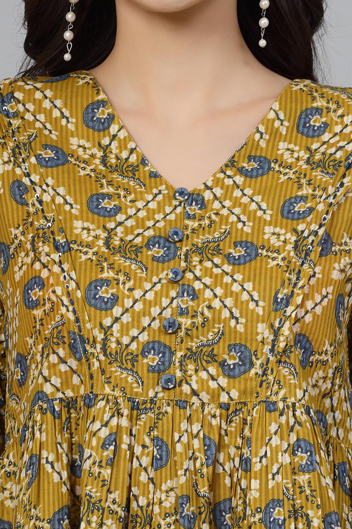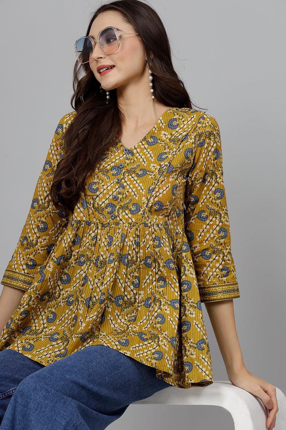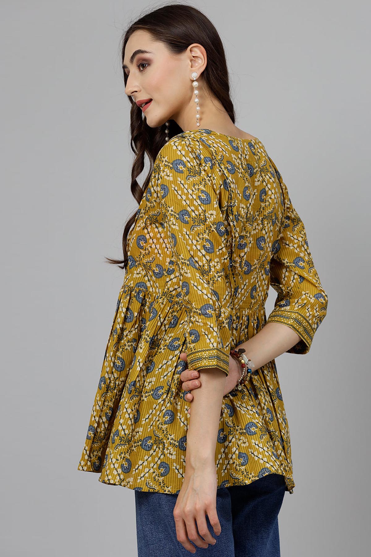 Ochre yellow pure cotton floral printed top with gathered waist, V neck, 3/4th sleeves and katha detailed work