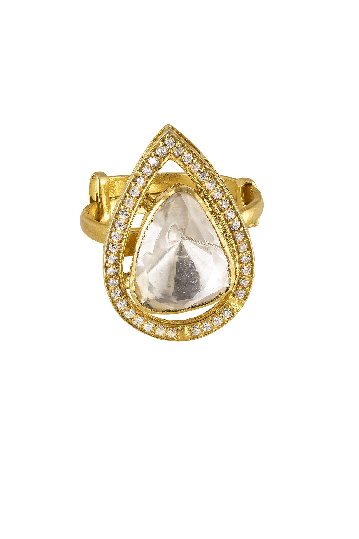 Yellow 925 silver drop diamond studded ring with moissanite polki and gold plating. The dimension is 0.98 x 0.55